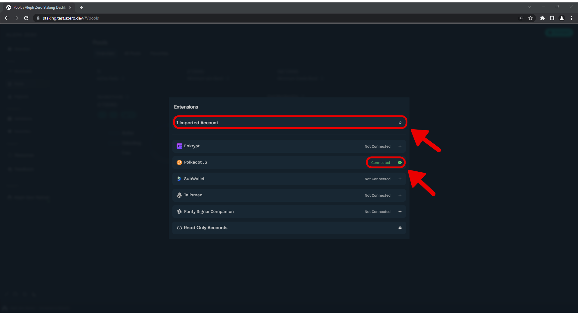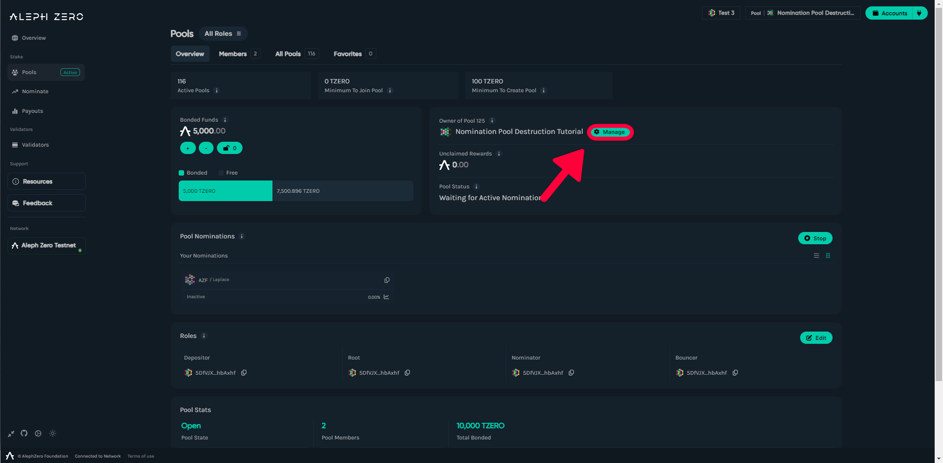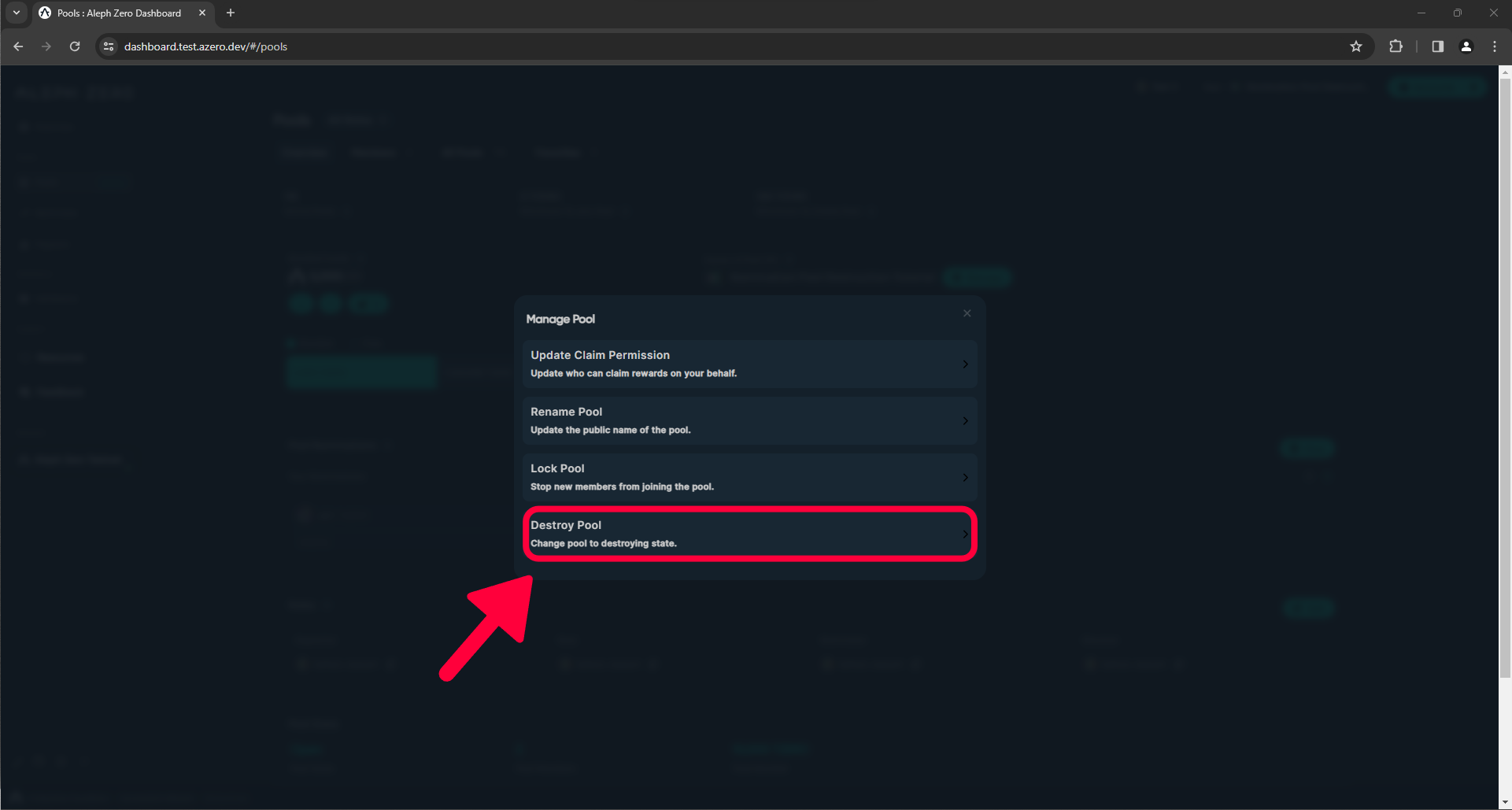 * Before you are able to destroy your pool via [the dashboard](https://dashboard.azero.dev/), you will need to make sure that your account is connected. You can create one as per [this tutorial](https://support.alephzero.org/en/articles/8254857-how-to-set-up-or-recover-your-azero-account-on-the-mainnet-using-aleph-zero-signer).