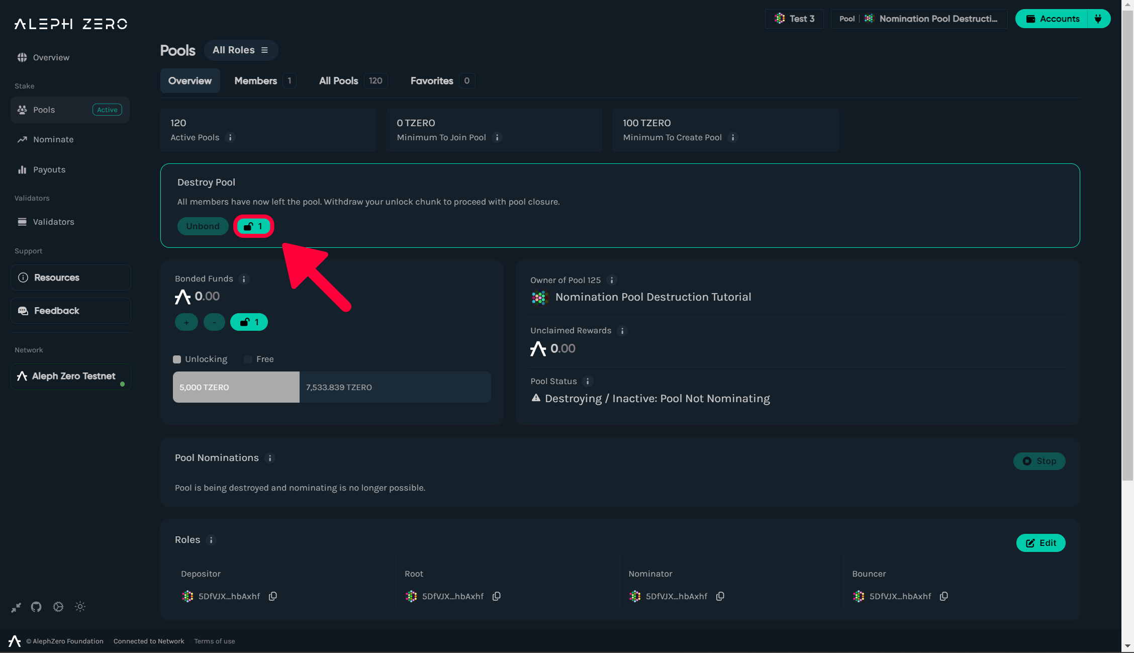# How to destroy a nomination pool via the Aleph Zero Dashboard