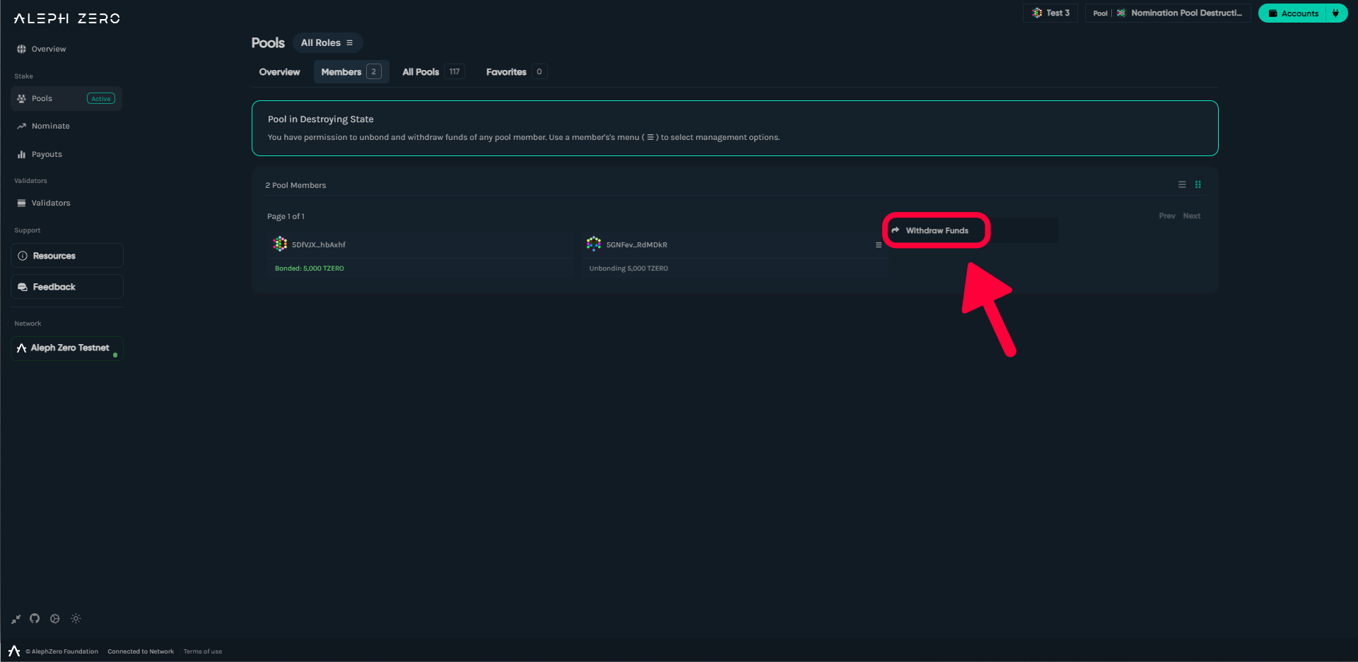 7. Your pool is now in the destroying state. The next step is to unbond members' coins. Head to the **'Members'** tab and select the hamburger menu, followed by **'Unbond funds'**. After 14 eras have passed, do the same and select **'Withdraw funds'**.