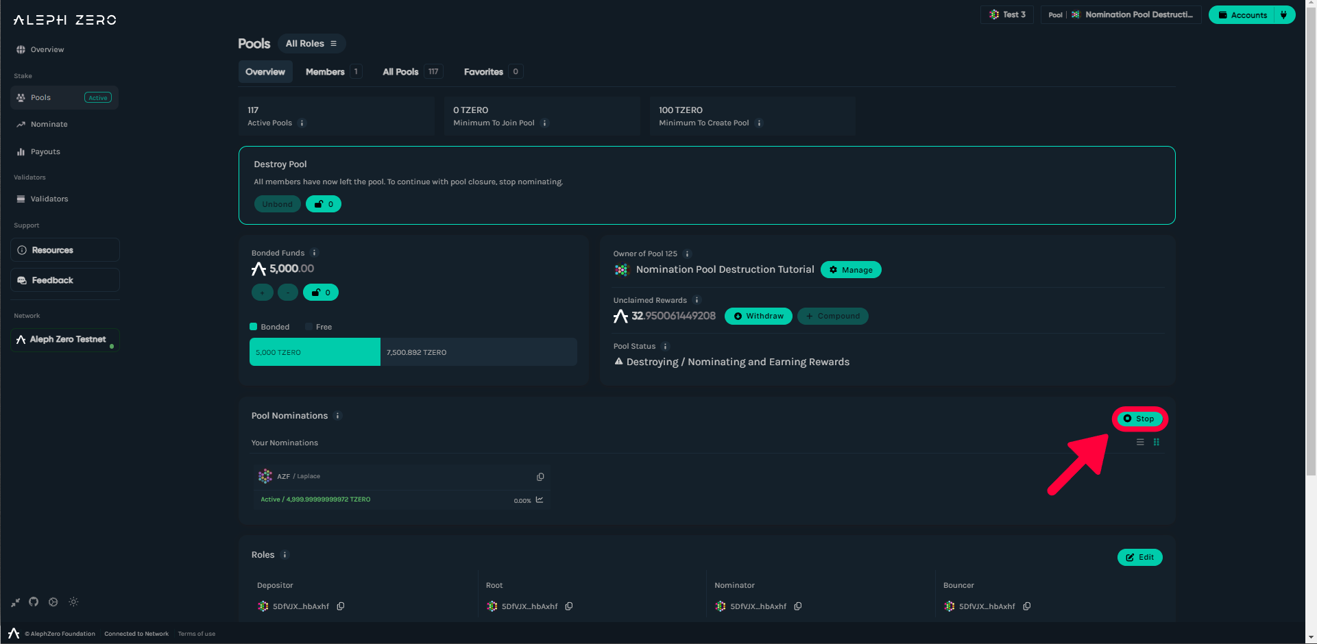 8. Now that all members have left the pool, you must stop nominating. Click **'Stop'**.